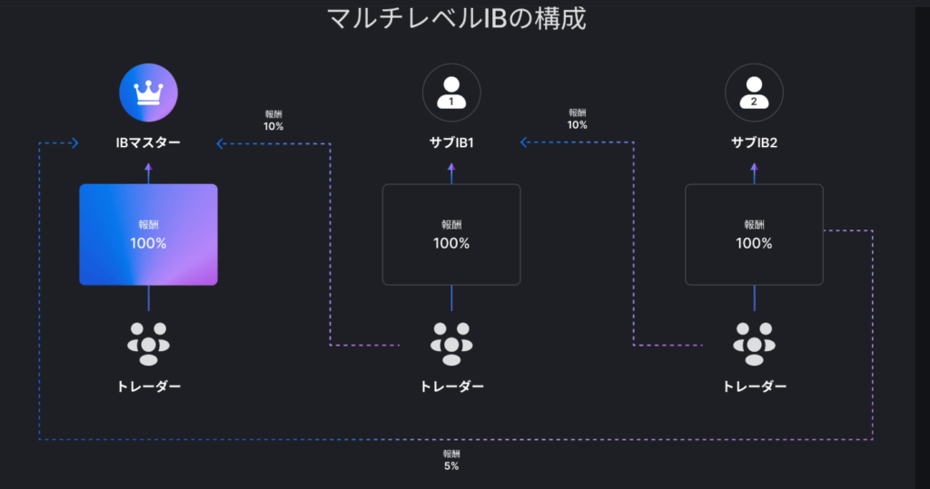 - 各サブIB自身は自分の紹介トレーダーの報酬を100%受け取る