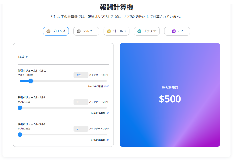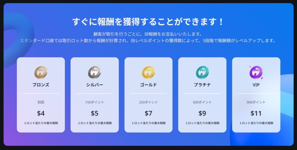 bitcastle FXには、「レベルポイント制度」があり、トレーダーの取引に応じてIBポイントが貯まり、規定ポイントに達するとランクが自動的に昇格します。ランクが上がると1ロットあたりの報酬単価も増え、最終的に最大11ドルのVIPランクまで到達できます。