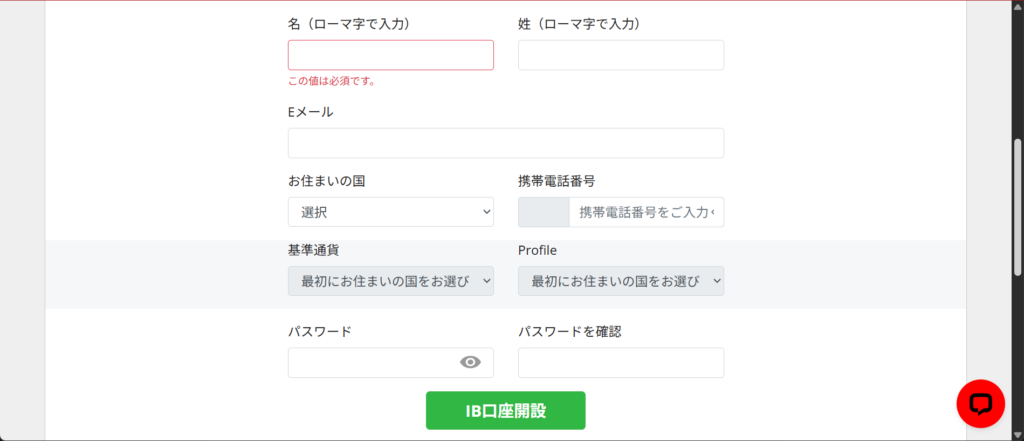 IBパートナー口座を開設する際には、公式サイトに表示される登録フォームに必要事項を入力します。すべての項目を正しく入力しないと承認されない可能性があるため、注意深く進めましょう。特に「名・姓」は必ずローマ字で入力する点に注意してください。